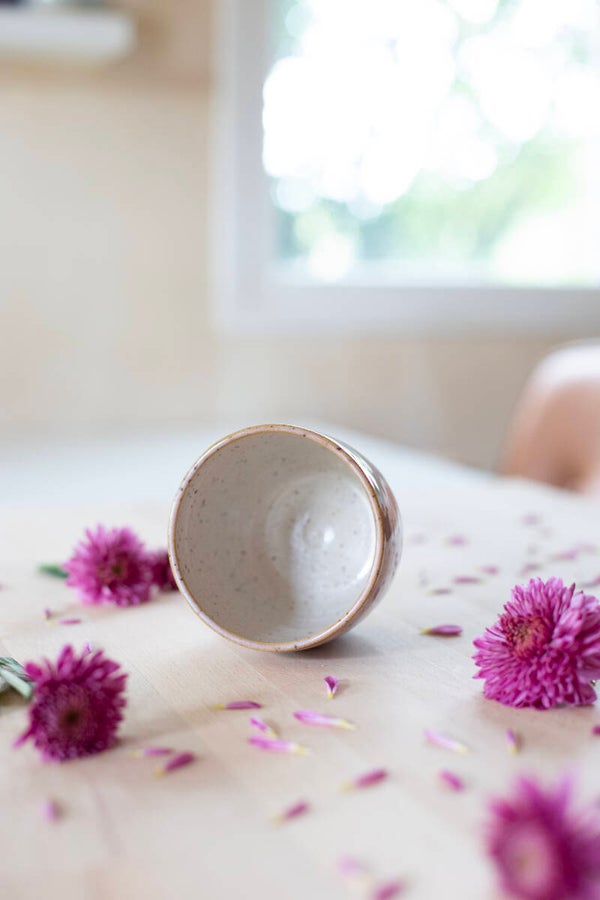 This is a cup with a spotted light blue glaze and with handpainted hearts.