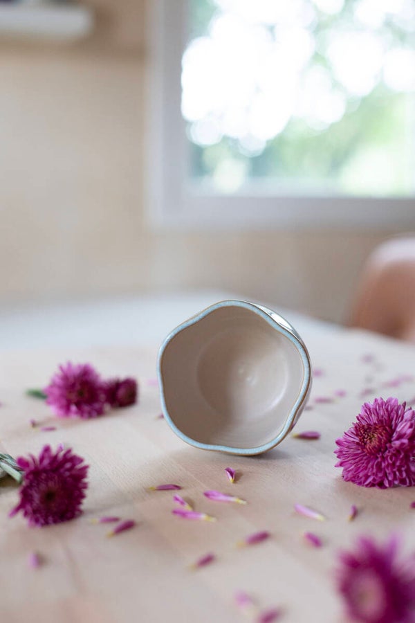 This is a flower cup with a light blue glaze and with handpainted hearts.
