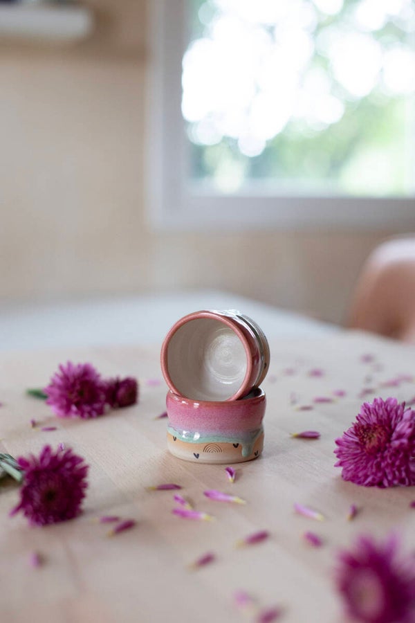 This is a set of 2 espresso cups with a pink to green glaze and with handpainted hearts.