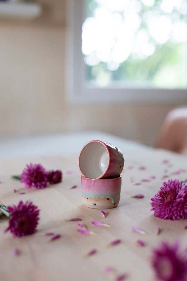 This is a set of 2 espresso cups with a pink to green glaze and with handpainted hearts.