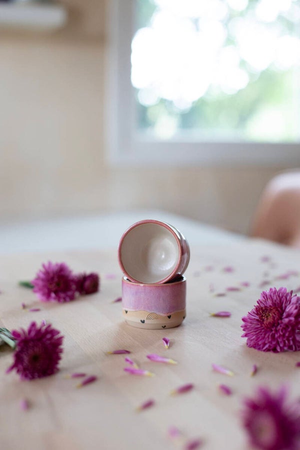 This is a set of 2 espresso cups with a pink glaze and with handpainted hearts.