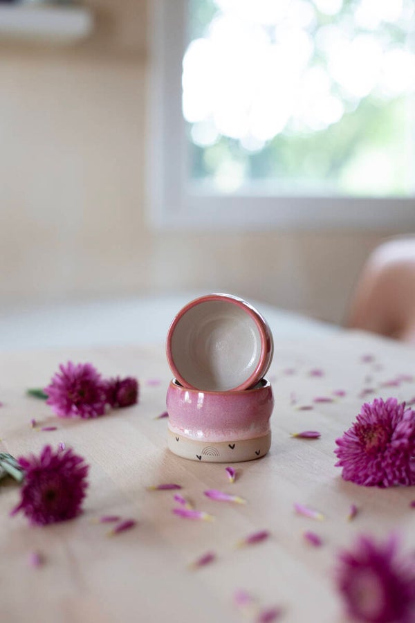 This is a set of 2 espresso cups with a pink to peachy glaze and with handpainted hearts.