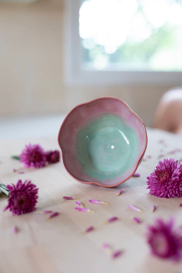 Flower Bowl with pink to green glaze and handpainted hearts.