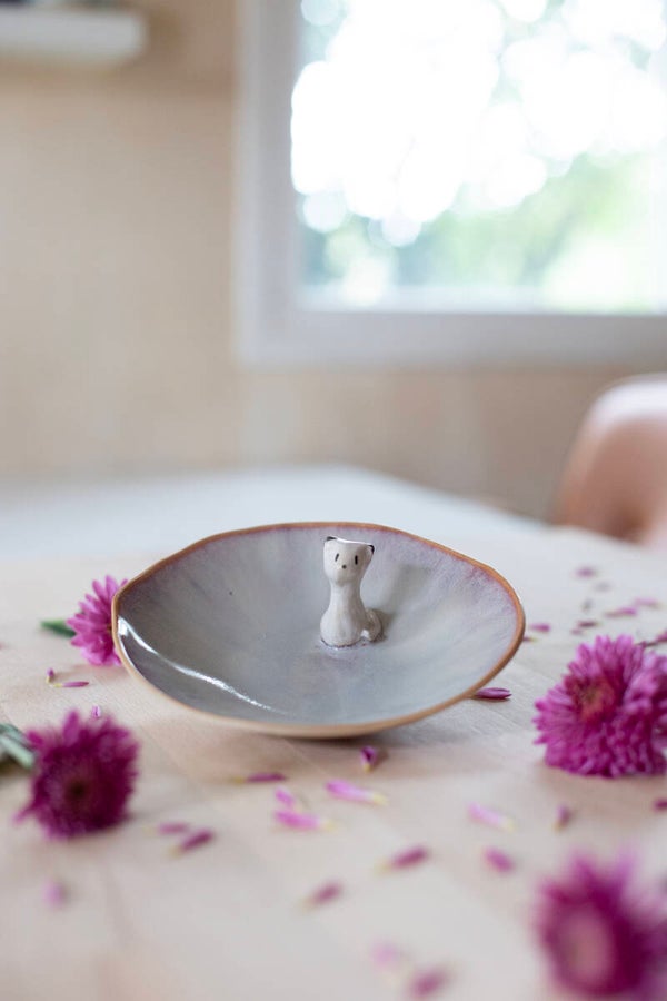 This is a jewelry or trinket dish with a greyish glaze with handmade little white cat.