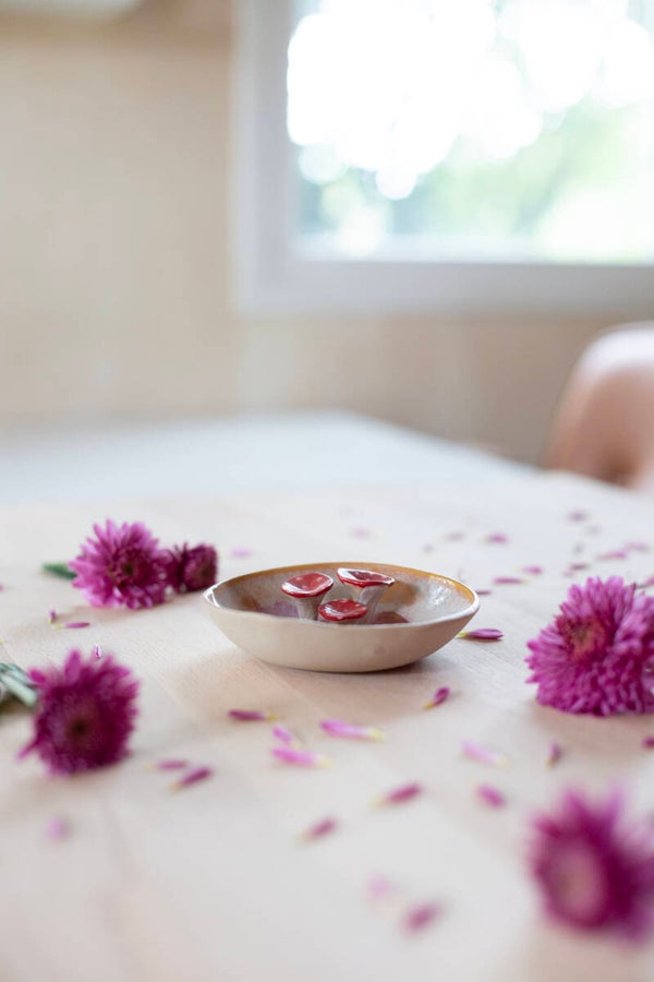 This is a jewelry or trinket dish with a mustard to pink glaze with handmade little mushrooms.