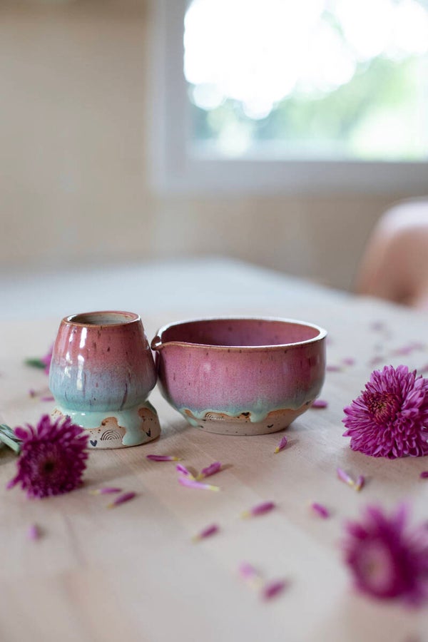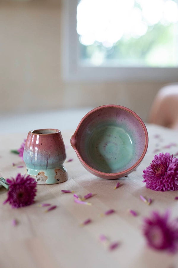 A Matcha Bowl + Whisk Holder Set with a pink to green glaze.