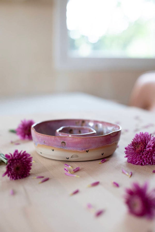A snack bowl with a spotted pink glaze.
