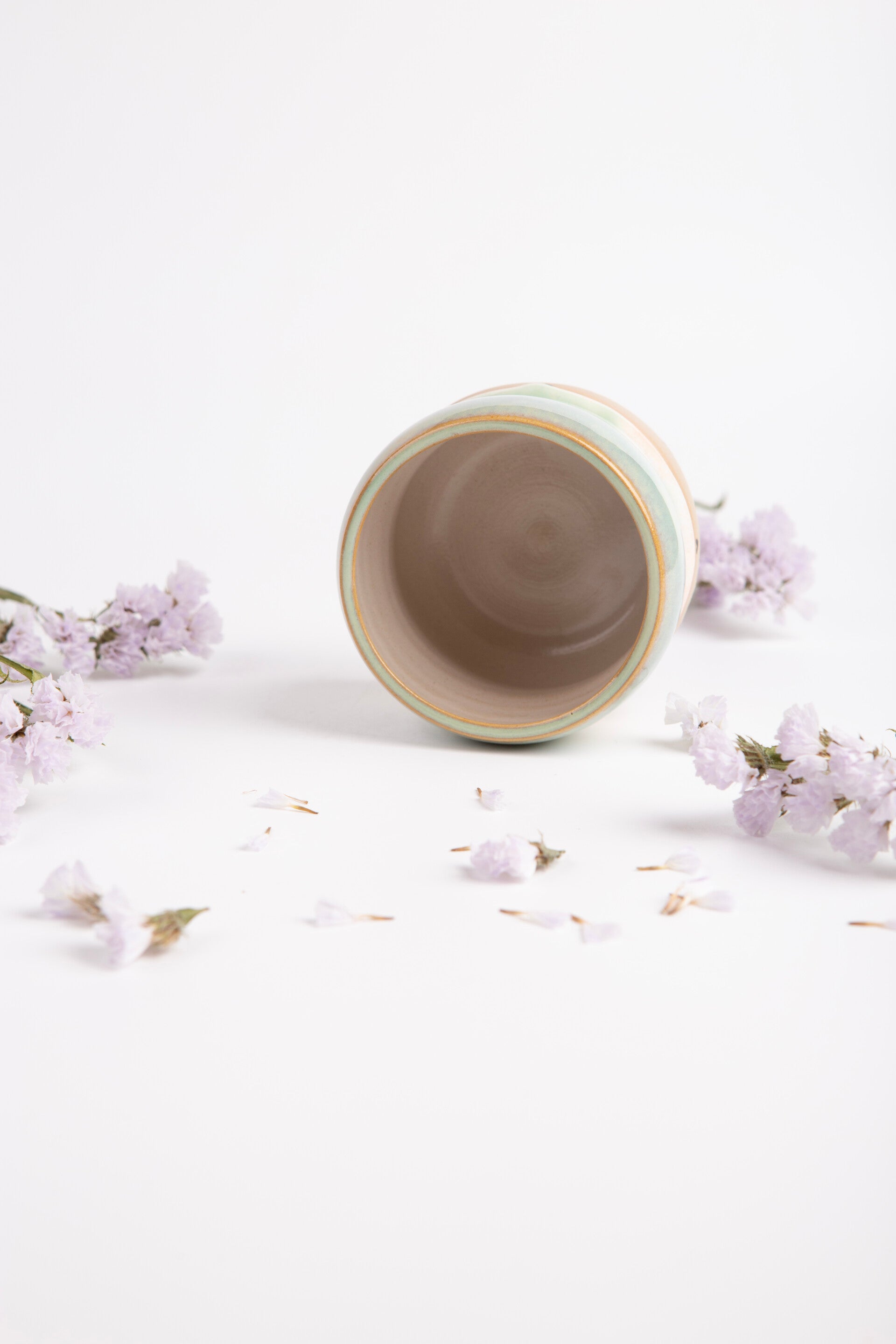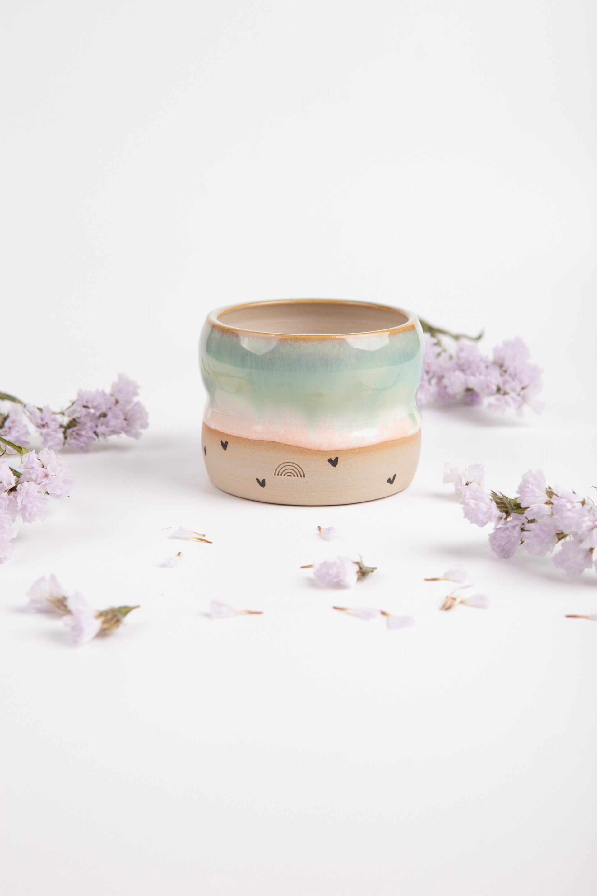 This is a cup with a green to peachy glaze and with handpainted hearts.