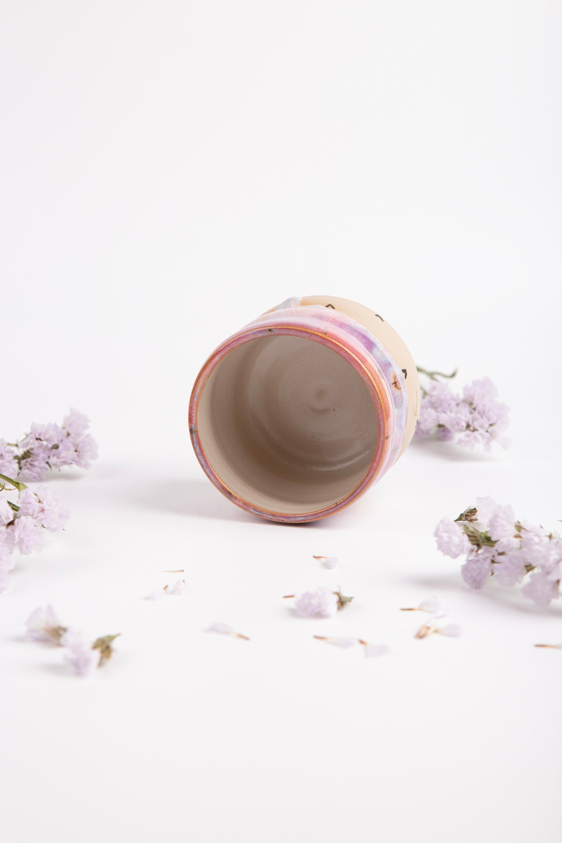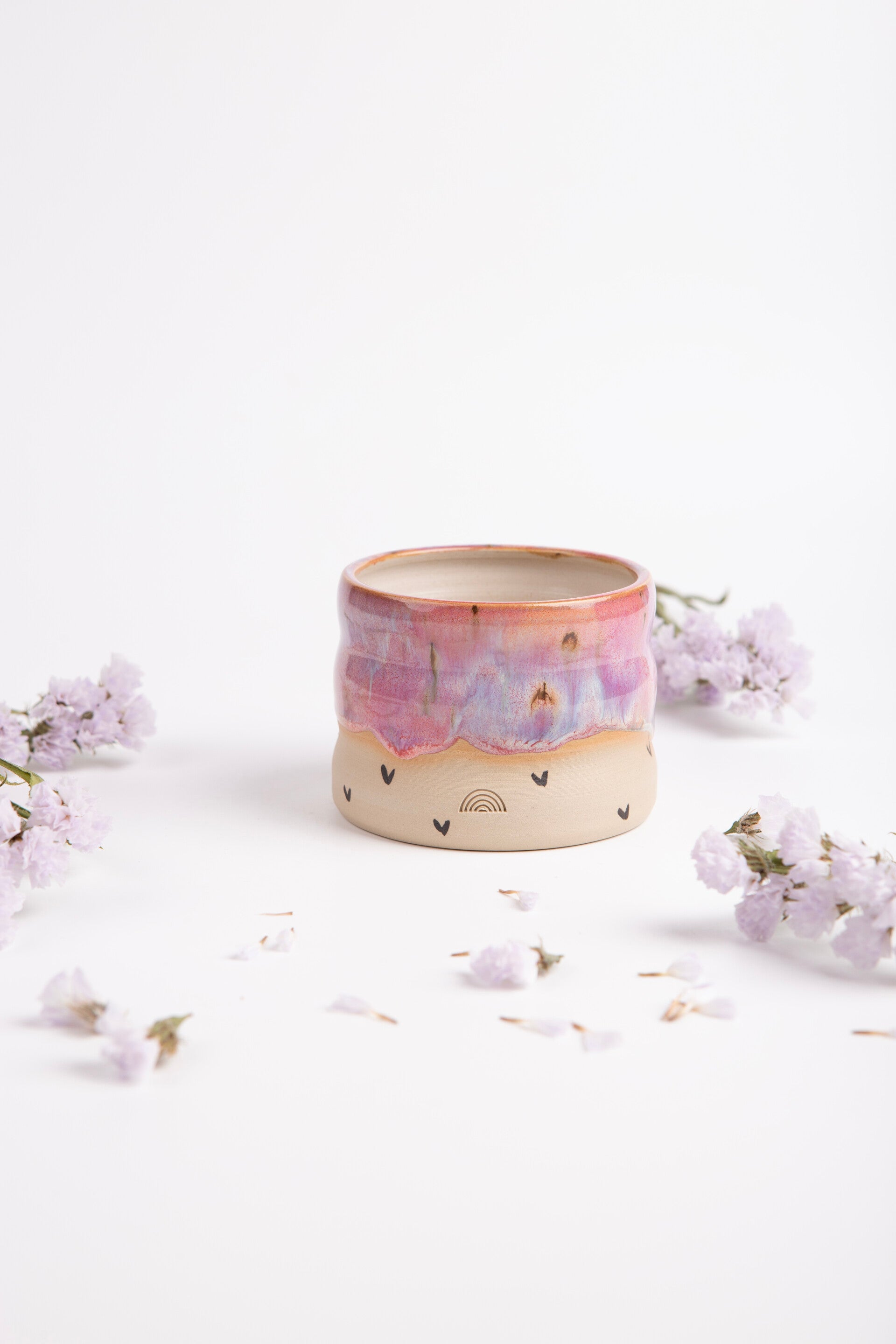 This is a cup with a spotted pink glaze and with handpainted hearts.
