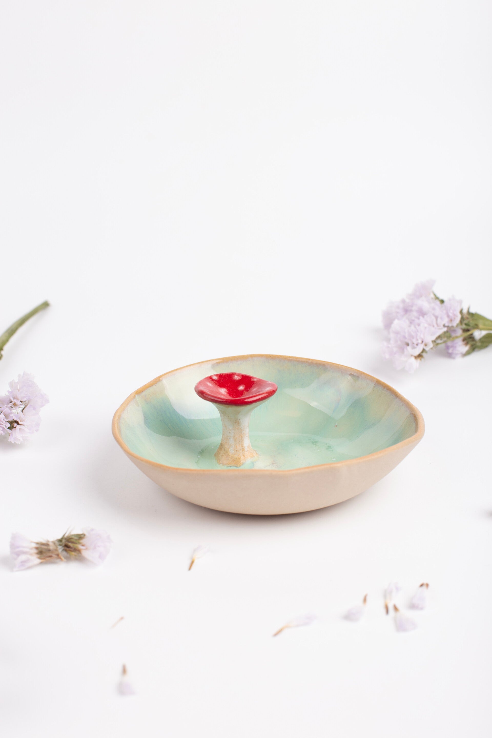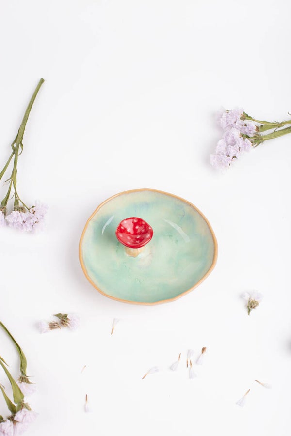 This is a jewelry or trinket dish with a green glaze with handmade little mushroom.